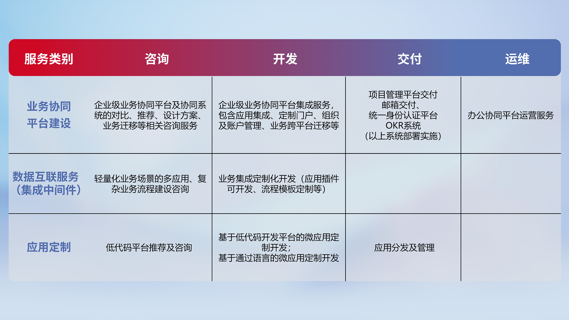 针对钉钉、、、企微、、、IDaas等平台级产品提供产品的规划、、方案、、、交付、、定制化开发等服务,,实现如统一协同办公、、、智能客户服务、、混合会议管理、、智能数据查询、、、等业务场景,,,实现数字化转型。。